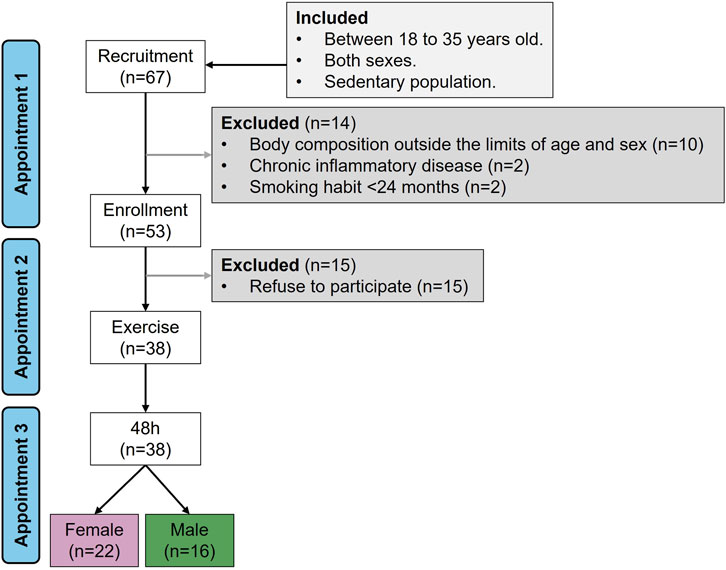 The participants were non-probabilistically recruited among students from the degree of Biomedical Engineering and the degree of Nursing at the Faculty of Medicine of Universidad Autónoma de Madrid (Spain). The protocol included three appointments. During appointment 1, a researcher of the team explained the protocol of the study and those interested. At this moment, the participants could resolve any type of doubt and signed the informed consent if they wished to participate in the study. Next, they filled several questionnaires, including (1) ad hoc sociodemographic tool related to age, educational level, economic situation and global health status, and (2) the self-report Activity Questionnaire for Adults and Adolescents (AQuAA) (Chinapaw et al., 2009), which explores the frequency and effort of common physical or sports leisure activities. The AQuAA has demonstrated validity and consistency (Busschaert et al., 2015), estimating activity by Metabolic Equivalent of Tasks (MET)*min/week (Liu et al., 2011). From AQuAA the sedentary and vigorous activities were calculated (kcal/kg*week), which was one of the exclusion criteria (see below). Thereafter, body composition was assessed by a scale-tallimeter (Tanita WB 380-H; BioLogica S.L., Barcelona, Spain) and impedanciometry (Bodystat 520, SN 510802; BioLogica S.L., Barcelona, Spain). From these data body mass index (kg/m2), fat mass (kg), lean mass (kg), muscle mass (kg), and basal metabolic rate (kcal/day) were calculated. Participants excluded from the study were those with chronic inflammatory conditions (diabetes, obesity or celiac disease), active smokers, body composition outside the normal range for age and sex, and those with a level of vigorous activities above 20 METs kcal/kg*week. A sedentary population was chosen to avoid adaptations induced by regular exercise which is known to modulate inflammation (Baskerville et al., 2024). A total of 67 participants were recruited, and from them 38 completed the study (match rate = 56.7%), 22 females and 16 males. The flow chart of recruitment and participation is shown in Figure 1.