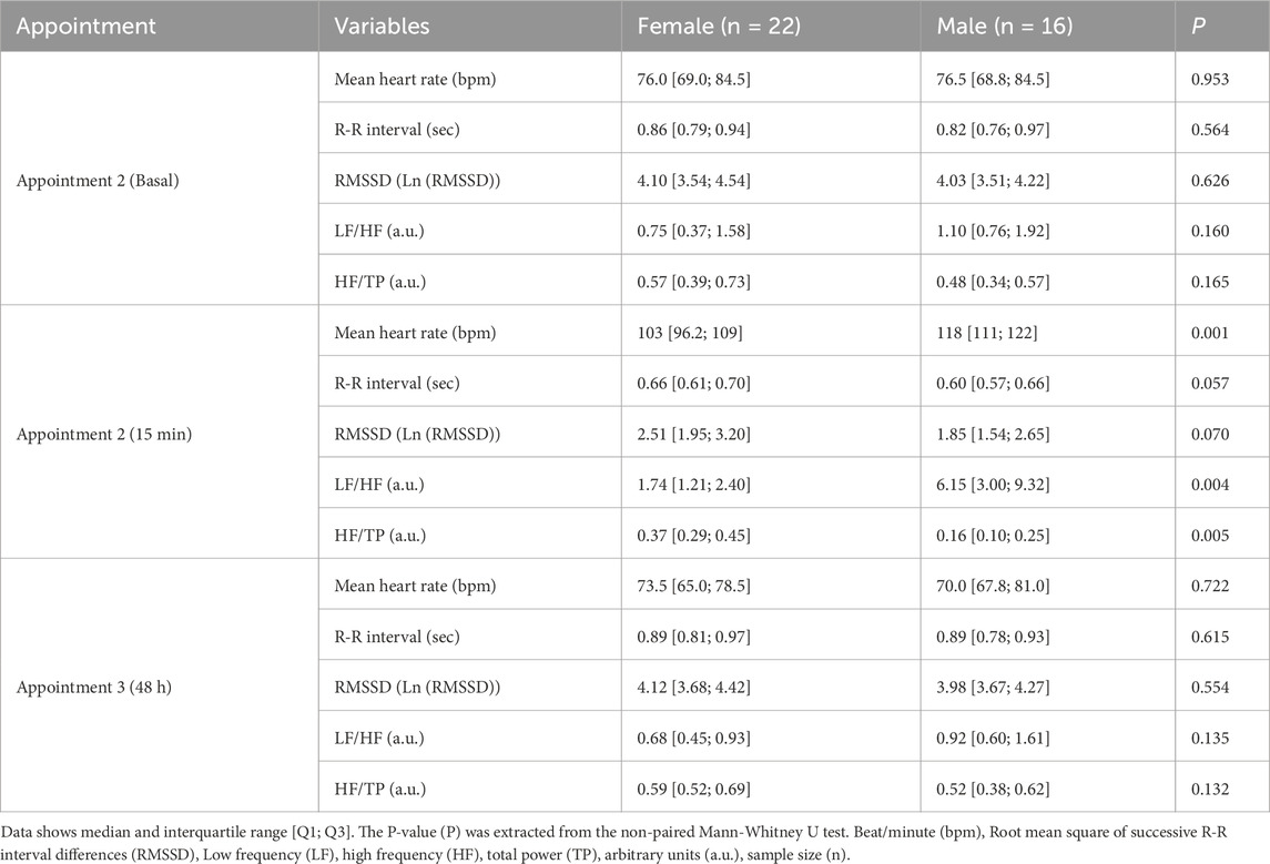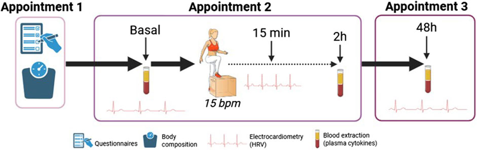 During appointment 2, the participants filled in the Food Frequency Questionnaire (FFQ), a tool of 120 items that estimates an individual’s nutritional pattern (Cui et al., 2023). This tool has been widely used in epidemiological studies (Cui et al., 2021) and has been validated in Spanish population (Larroya et al., 2024). The data obtained was recorded manually in an ad hoc data frame and evaluated using FFQ EPIC tool for analysis (FETA) (Mulligan et al., 2014), which is an open-source software, facilitating research on dietary intake, estimating carbohydrate, protein and fat (g/day), and energy (kcal/day). Women were asked about the phase of the menstrual cycle. Thereafter, cardiovascular parameters (blood pressure and HRV) were measured before (at rest) and 15 min post-exercise. In addition, blood samples were taken before and 2 h post-exercise. Finally, the participant was asked to come back for an appointment 3 after 48 h. During this 3rd visit, cardiovascular parameters were measured, and a blood sample was taken. The study design is shown in Figure 2.