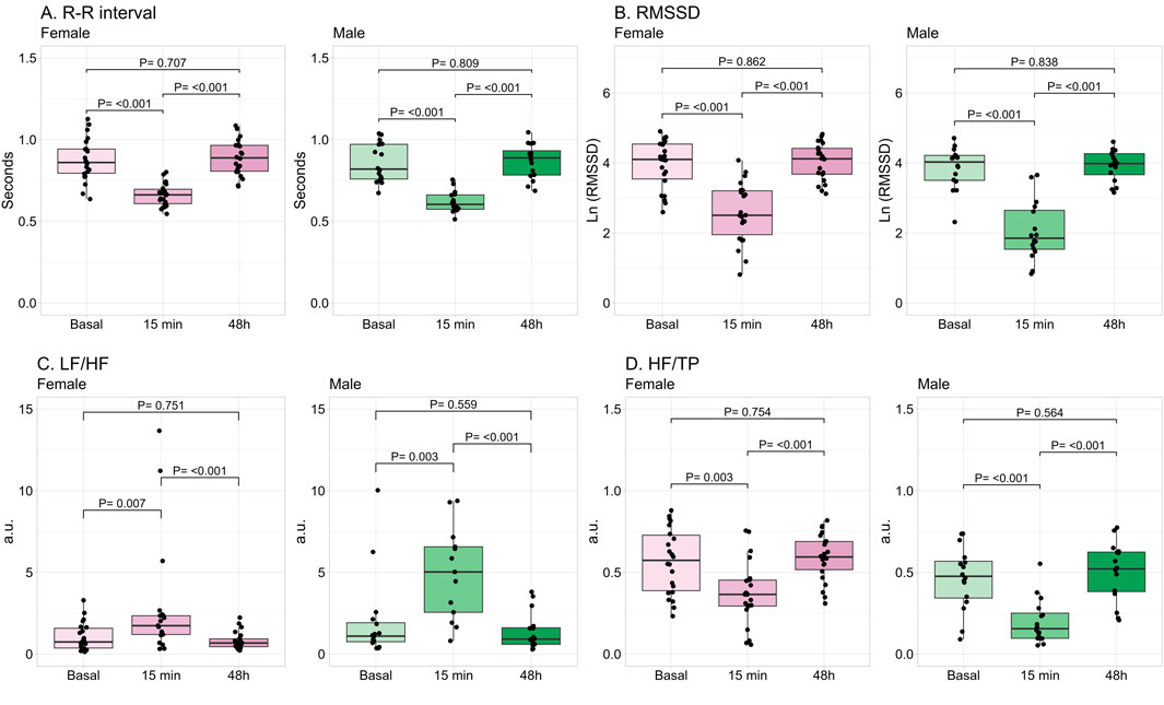 All HRV variables were significantly modified at 15 min post-exercise. The time-domain variables (R-R interval and RMSSD) were reduced (Figures 3A,B). Regarding frequency-domain, LF/HF was increased, while HF/TP was significantly reduced (Figures 3C,D). These modifications were observed in both female and male participants, returning to basal values after 48 h in both sexes.