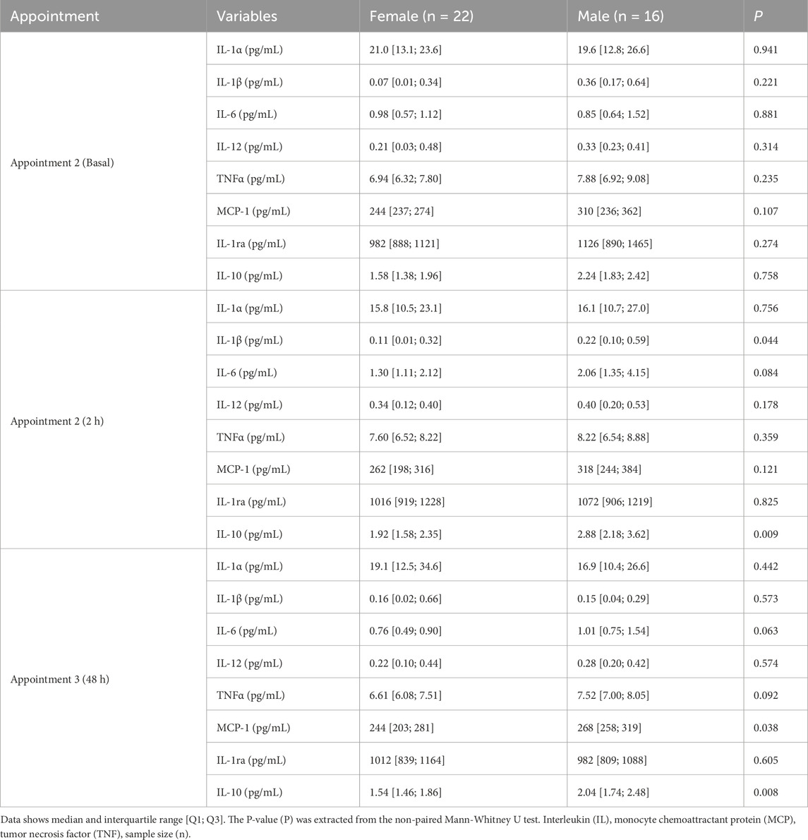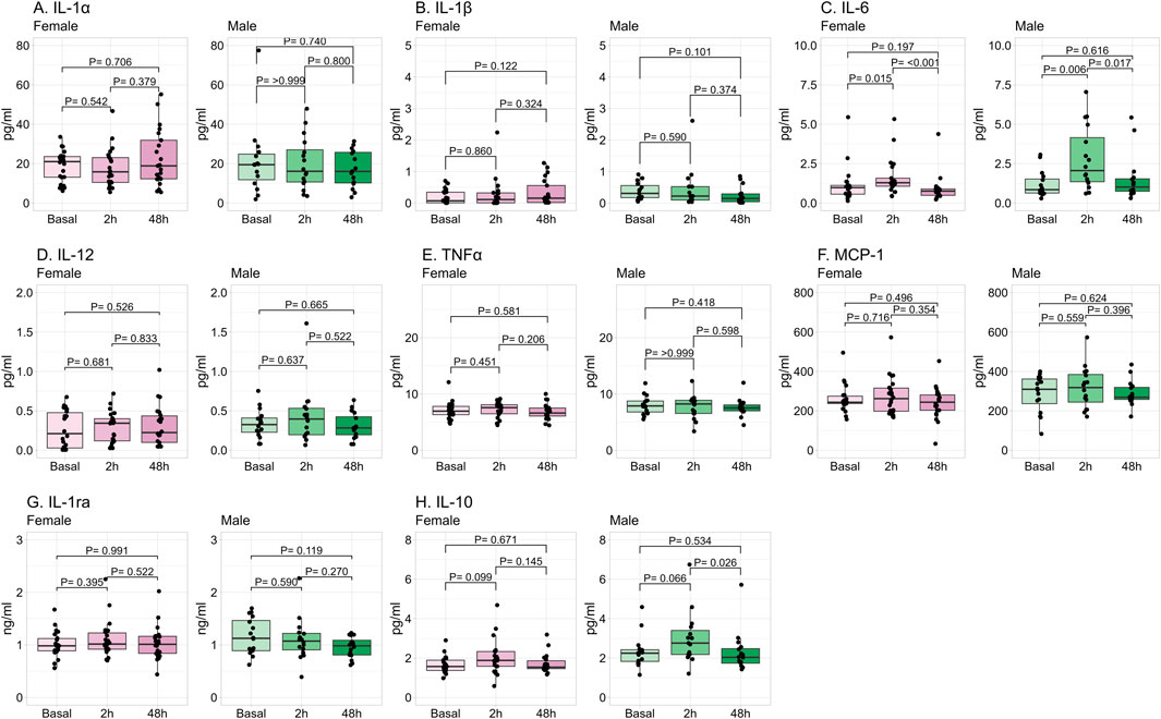 Regarding the influence of sex on cytokines, no significant differences were found in the cytokine levels in basal conditions. At 2 h post-exercise, IL-1β and IL-10 were significantly higher in male compared to female participants, and IL-6 also tended to be larger. At 48 h post-exercise, MCP-1 and IL-10 were significantly higher in males compared to females, with the same tendency for TNFα and IL-6 (Table 3).