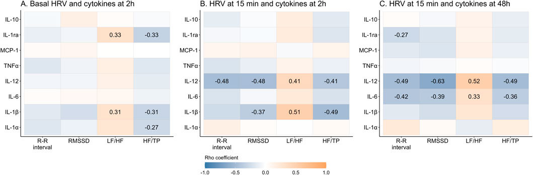 Regarding the correlations between basal HRV and cytokines 2 h post-exercise (which represent the immediate pro-inflammatory period) a positive significant correlation was found between LF/HF, and IL-1β and IL-1ra. Instead, negative and significant correlations were found between HF/TP with IL-1α, IL-1β and IL-1ra (Figure 5A). With respect to HRV at 15 min post-exercise and cytokines measured during the immediate proinflammatory period, a positive association was found between LF/HF and IL-1β and IL-12, while HF/TP and RMSSD negatively correlated with these cytokines. Additionally, R-R interval showed a significant negative correlation with IL-12 (Figure 5B). Regarding the correlations between HRV variables at 15 min and cytokines at 48 h post-exercise (which represents the resolution period), a similar pattern of correlations was found, a positive correlation between LF/HF and IL-12 and IL-6, and negative for R-R interval, RMSSD and HF/TP with both cytokines. Additionally, R-R interval was negatively correlated with IL-1ra (Figure 5C). There were no significant correlations between basal HRV and plasma cytokines at basal point or 48 h post-exercise. Similarly, no correlations were found between HRV parameters at 48 h and previous plasma cytokines (data not shown).