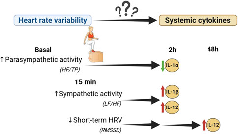 We also found that female had lower elevation of IL-10 compared to male participants, in agreement with a report on intramuscular cytokine mRNA expression induced by exercise (Luk et al., 2021). It has also been described that IL-10-mediated inhibition of proinflammatory cytokines (TNFα, IL-1β, and IL-15) is lower in females, suggesting a larger recovery period after exercise for women (Islam et al., 2022). In summary, we conclude that the exercise used in the present study induces a moderate inflammatory response through IL-6, followed by a physiological anti-inflammatory effect mediated by IL-10. The lack of significant elevation of other cytokines may be related to the moderate exercise protocol, together with the negative feed-back loops created by IL-6 and IL-10 and, although not significantly elevated, may be relevant and therefore, their relationship with HRV was also explored.