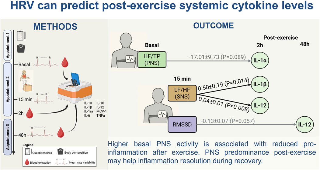Converging evidence suggests that ANS regulates an inflammatory reflex and HRV has been proposed to monitor human inflammatory processes (Williams et al., 2019). An association between a lower HRV, vagal tone and higher levels of pro-inflammatory cytokines has been reported in pathological situations, including panic disorders (Herhaus et al., 2023), major depression (Euteneuer et al., 2023), and psychosocial distress (Merker et al., 2022). HRV has been proposed to predict outcomes of non-communicable diseases -such as diabetes-through the relationship between HRV, vagal activity and inflammation reduction (Gidron et al., 2018; Sorski and Gidron, 2023). ANS has an important influence on physical activity; SNS is stimulated by exercise, while the PNS contributes to the recovery process. In athletes, HRV has been used as an indicator of the capacity to adapt to exercise, to evaluate the degree of activation and recovery (Bellenger et al., 2016; Güngör et al., 2024), to identify overtraining and to predict performance (Lundstrom et al., 2023). However, few studies have evaluated the association between HRV and the inflammatory response in trained individuals (Holmes et al., 2020). There is also lack of information on this relationship in non-trained subjects. Given the key role of inflammation in muscular damage induced by physical exercise it would be desirable to confirm this potential association, which could help to monitor non-invasively inflammation and recovery. The hypothesis of this study was that HRV can be used as a predictor of inflammation caused by physical exercise in non-trained subjects. Therefore, the aims were to evaluate, in a sedentary healthy young population, the relationship between HRV, and the most relevant cytokines induced by exercise, analyzing the influence of sex.