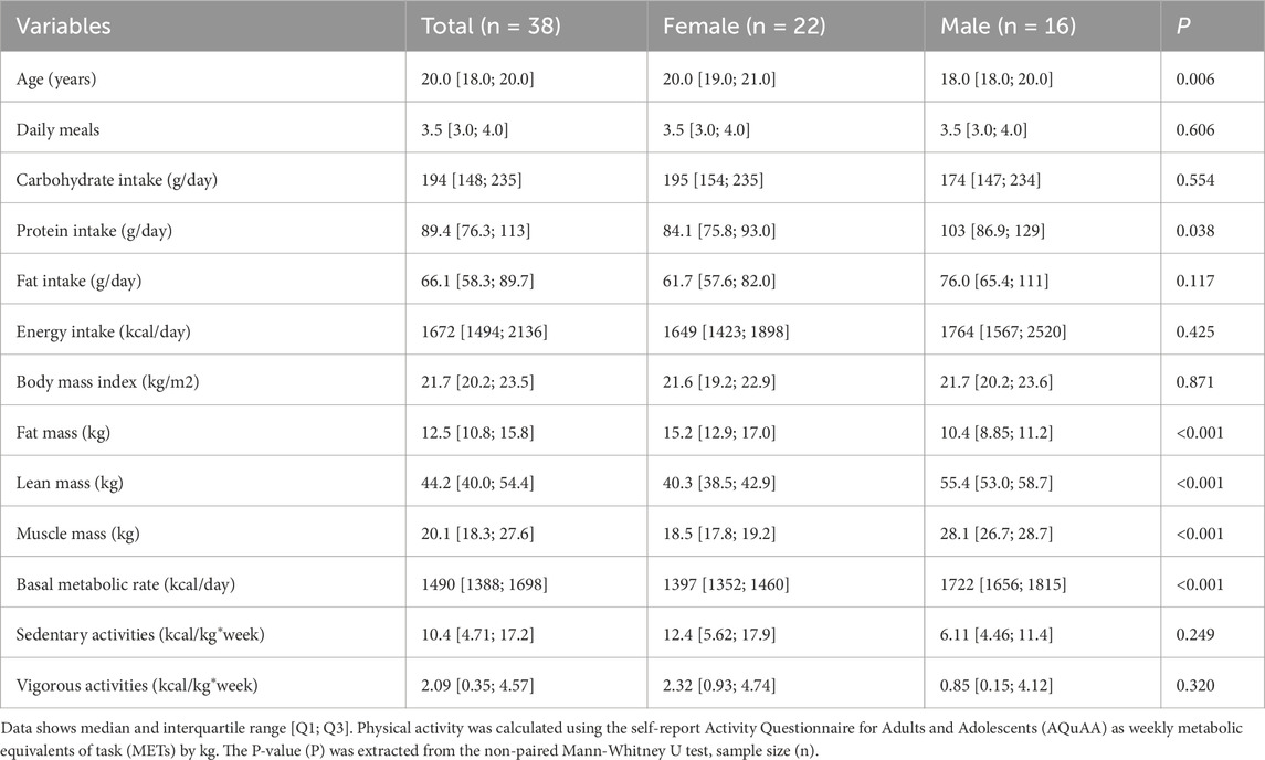 At appointment 2, 18.2% (n = 4) of recruited women were in active menstruation, 45.5% (n = 10) were in the follicular phase, and 36.4% (n = 8) were in the luteal phase of the menstrual cycle. Regarding sex differences in sociodemographic, nutritional and anthropometric factors, significant differences were found in age, which was larger in females compared to males, and in protein intake, which was higher in male than female participants. Body composition was also different between sexes, as expected. The cohort had a sedentary-to-light intensity aerobic physical activity, with non-significant differences between sexes in weekly sedentary or vigorous activities (Table 1).