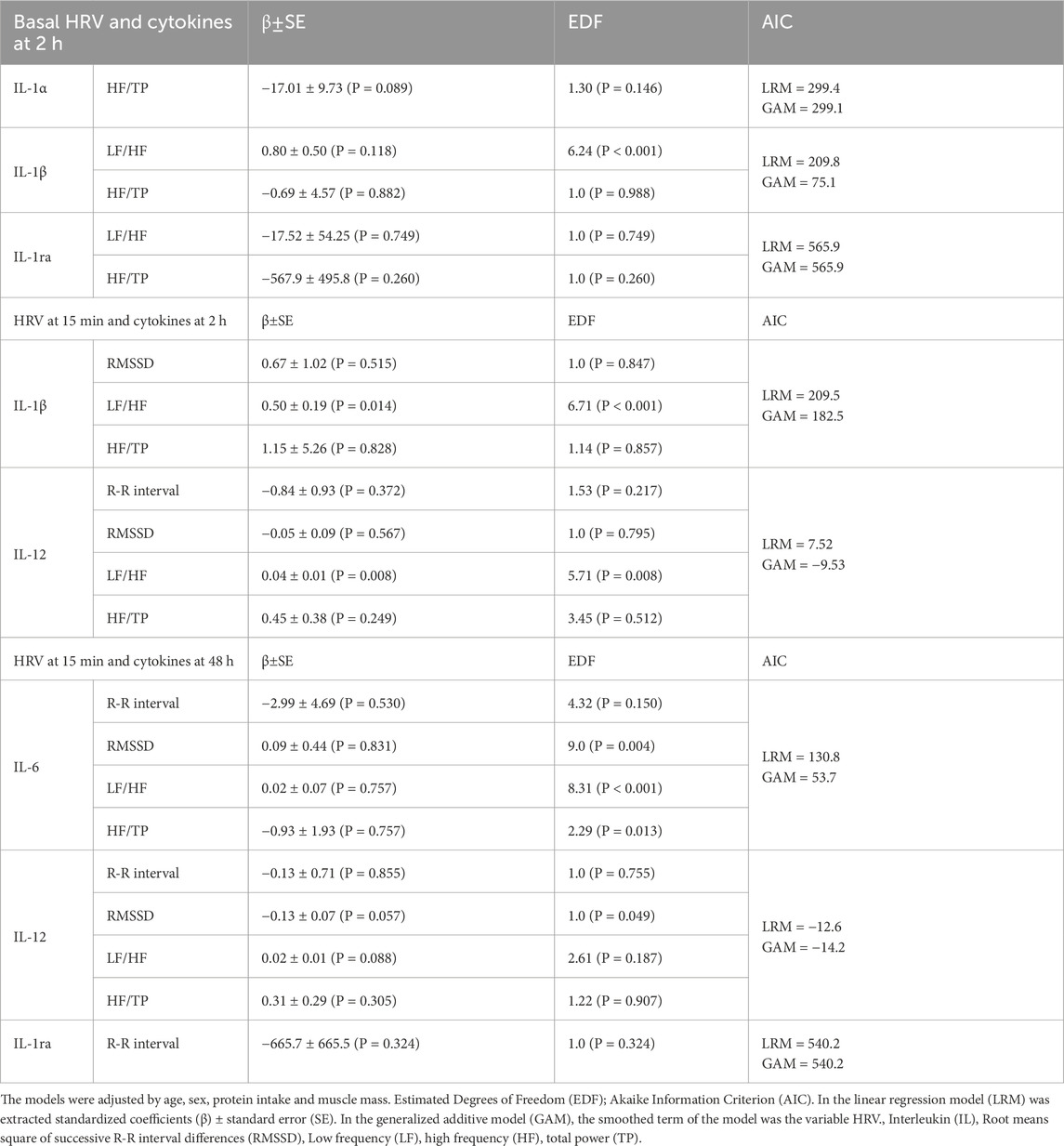 Table 4. Linear and additive analysis of HRV and plasma cytokine over time induced by physical activity.