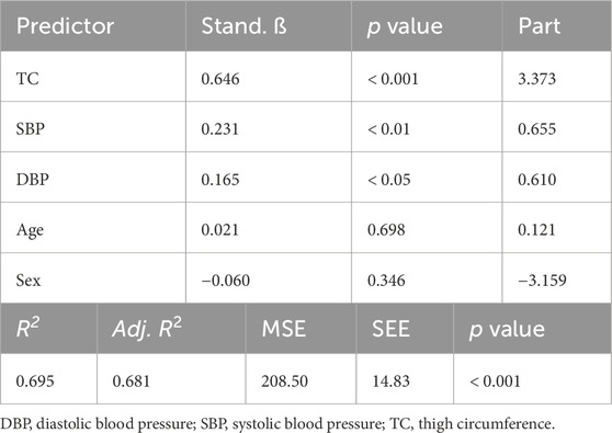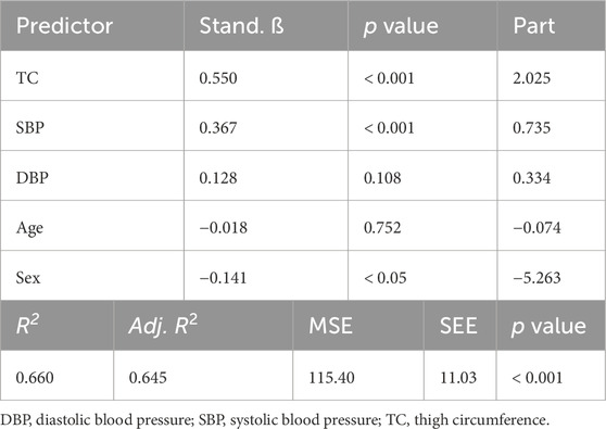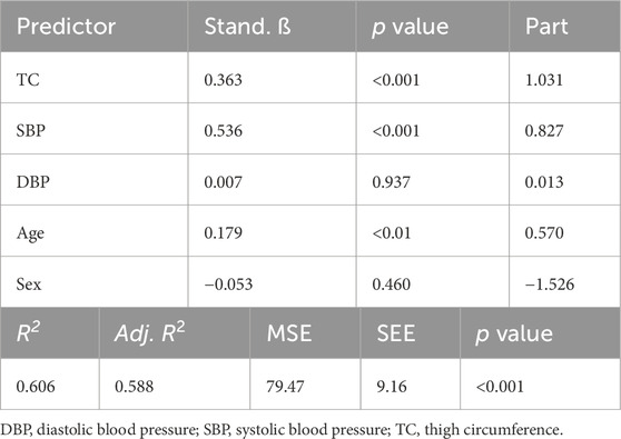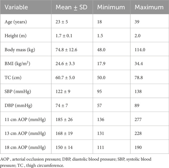 For the implementation of exercise with blood flow restriction (BFR), it is recommended that cuff pressures be selected based on arterial occlusion pressure (AOP) (Patterson et al., 2019) which is the pressure required to occlude arterial blood flow to a limb. Selecting pressures relative to AOP ensures a standardized level of arterial restriction during exercise, typically within the 40%–80% AOP range, which is considered both safe and effective. Clinicians, coaches, and athletes, however, may not have access to equipment needed for directly assessing AOP (i.e., Doppler ultrasound, handheld Doppler, cuffs with pressure sensors). To develop alternative methods for establishing cuff pressures, several authors (Cirilo-Sousa et al., 2019; Jessee et al., 2016; Loenneke et al., 2015; Loenneke et al., 2012; Sieljacks et al., 2018; Wedig et al., 2024) have investigated anthropometric, hemodynamic, and sociodemographic variables as predictors of AOP. Reports (Cirilo-Sousa et al., 2019; de Queiros et al., 2024; Loenneke et al., 2015; Loenneke et al., 2012; Sieljacks et al., 2018; Wedig et al., 2024) focusing on the lower-limbs indicate that measures of thigh circumference (TC) and various measures of blood pressure, including brachial systolic (SBP) and diastolic blood pressure (DBP), serve as the strongest predictors of AOP, collectively explaining ∼40–70% of the variance between individuals.