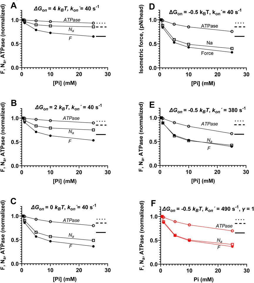 Figure 6. Effects of varied actin affinity in the AMDP state (related to ΔGon) on the [Pi]-dependence of isometric force (F), ATPase, and Na. (A) Standard parameter values are as shown in Supplementary Tables S1, S2, including ΔGon = 4 kBT. (B) As in A, but ΔGon = 2 kBT. (C) As in A, but ΔGon = 0 kBT. (D) As in A, but ΔGon = −0.5 kBT. (E) As in A, but ΔGon = −0.5 kBT and kon´ = 380 s-1, making the maximum value of kon(x) (kon (9)) equal to the value with the standard parameter values, as in A. (F) As in A, but ΔGon = −0.5 kBT, γ = 1, and kon´ = 490 s-1, making the maximum value of kon(x) (kon (9)) equal to the value with the standard parameter values. These simulated results are compared to experimental data from the literature in Supplementary Figure S1, where the simulations are also reproduced to mimic (cf. Supplementary Table S3) the lower temperature of the experiments. All data are normalized to simulated values at 0.5 mM Pi. The dotted, dashed, and full horizontal lines to the right in each panel indicate the reduction in ATPase, Na, and F upon increasing Pi from 0.5 to 25 mM for the conditions in panel A.