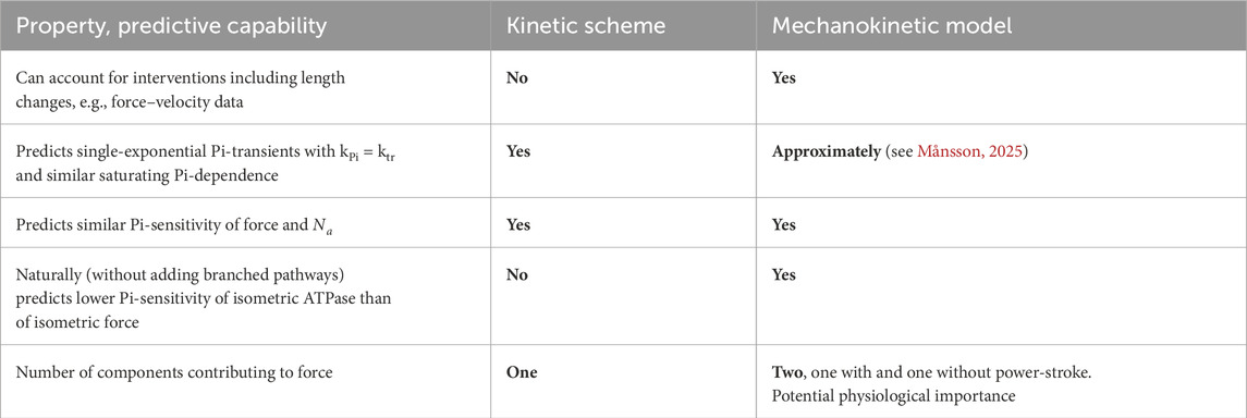 Table 1 summarizes the most central aspects of the differences and similarities between the mechanokinetic model in Figure 2 and the kinetic scheme in Figure 1, with emphasis on the capabilities to predict the important effects of varied [Pi].