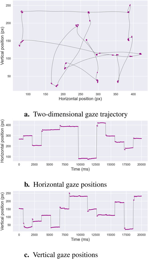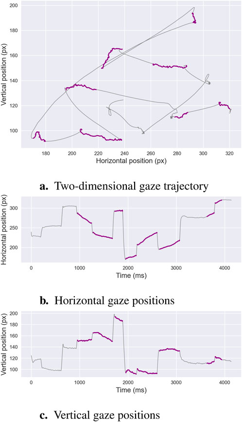 Figure 2. Ternary Segmentation. This example illustrates an oculomotor recording comprising fixations, saccades, and smooth pursuits. Panel (a)shows the two-dimensional gaze trajectory, where fixations are marked in purple, saccades in gray, and smooth pursuits in blue. Panels (b,c)display the corresponding horizontal and vertical gaze positions over time, highlighting the gradual directional displacements characteristic of smooth pursuit movements. These distinguishing features are the focus of ternary segmentation algorithms, which aim to isolate pursuit sequences from other phases.