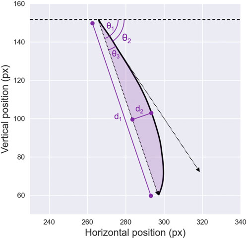 To address these shortcomings, the area curvature metric has emerged as a more robust and popular approach, as it incorporates the entire trajectory of the saccadic eye movement (Walker et al., 2006). This metric is typically calculated by evaluating the area beneath the curve formed by the sampled trajectory, relative to the direct distance between the starting and ending points of the saccade. The curvature metrics discussed so far are illustrated in Figure 4. Additionally, Ludwig and Gilchrist (2002) proposed deriving saccade curvature directly from second- and third-order polynomial fits. Like the area curvature approach, this method uses the full set of samples from a given saccade, which enhances its robustness by making it less sensitive to sampling noise.