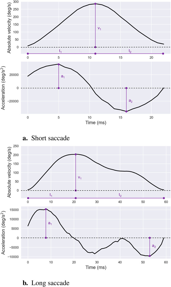 Figure 5. Saccade Velocity and Acceleration Profiles. Examples of saccade velocity and acceleration profiles for short — (a) — and long — (b) —- saccades, illustrating differences in peak values and overall shapes. For both types of saccades, the peak velocity is denoted as