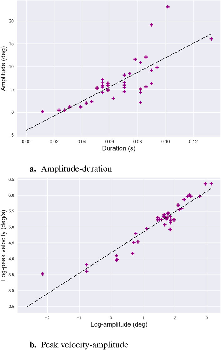 While mean velocity provides a useful summary metric, it becomes less effective for saccades larger than 10°, which often exhibit asymmetric velocity profiles—Figure 5b. For such larger saccades, saccade peak velocity is typically preferred as it reflects the highest firing rates of burst neurons driving the movement (Galley, 1989). Unlike mean velocity, peak velocity has computational advantages: it remains consistent regardless of segmentation thresholds—see Section 2 for further details—making it robust to variations in how sharply a saccade terminates during its final phase.