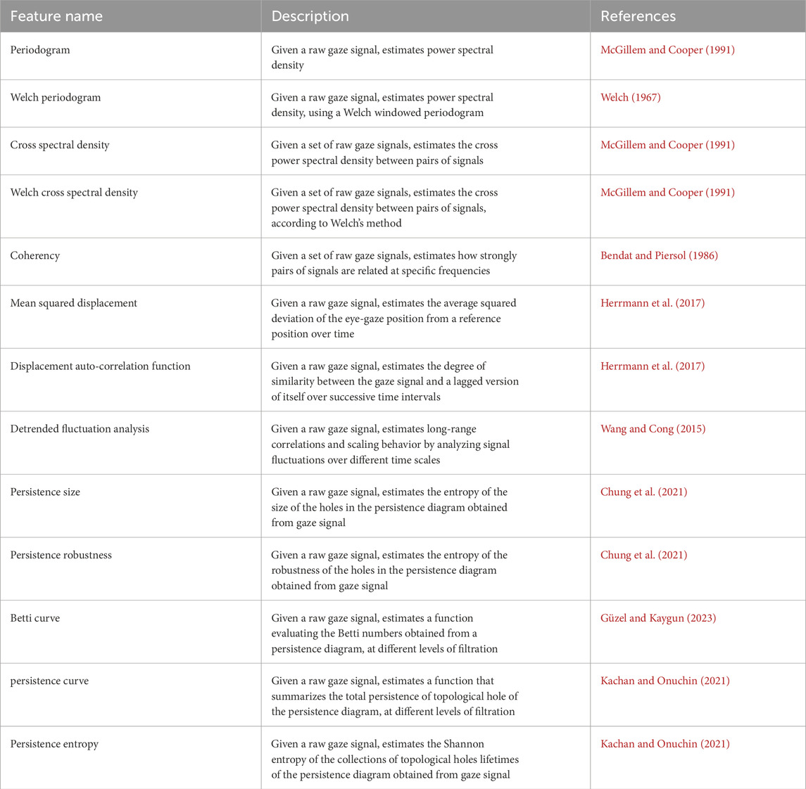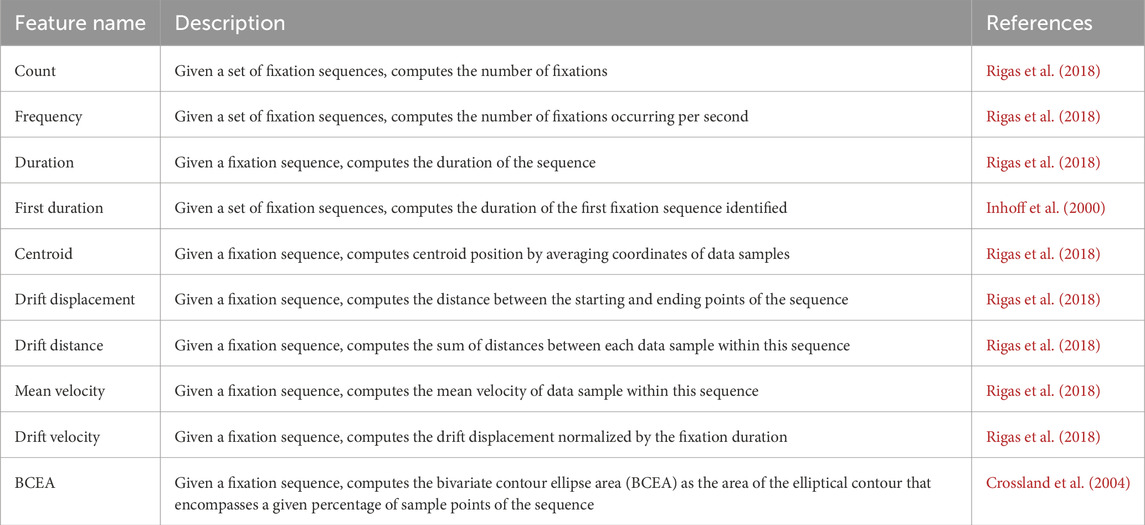 As such, the drift displacement is calculated as the distance between the starting and ending points of each fixation sequence. Similarly, the cumulative drift distance, which reflects ocular stability during fixation, is obtained by summing the distances between all consecutive fixational data samples from a given fixation sequence. Another feature, the drift mean velocity, is computed as the average of the first-order position derivatives of the fixation data samples and can be used to characterize the minor movements occurring during fixation sequences. Together, these measures can provide valuable insights into the stability of eye movements during fixation, which may be particularly useful for detecting pathological conditions, such as sight impairments and cerebellar diseases (Leech et al., 1977; Schor and Westall, 1984).