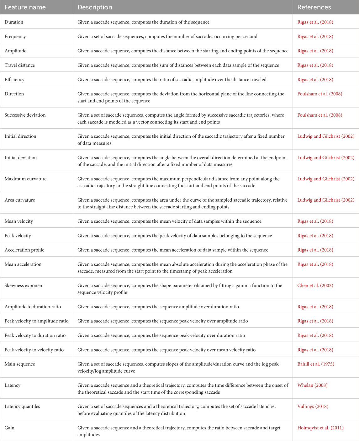 However, simple metrics such as amplitude, efficiency—as discussed in Section 3.2.2 — and direction alone are insufficient for fully capturing the complexity and non-linearity of saccadic trajectories. To address this gap, several additional features have been developed to better characterize the curvature of saccadic movements (Ludwig and Gilchrist, 2002).