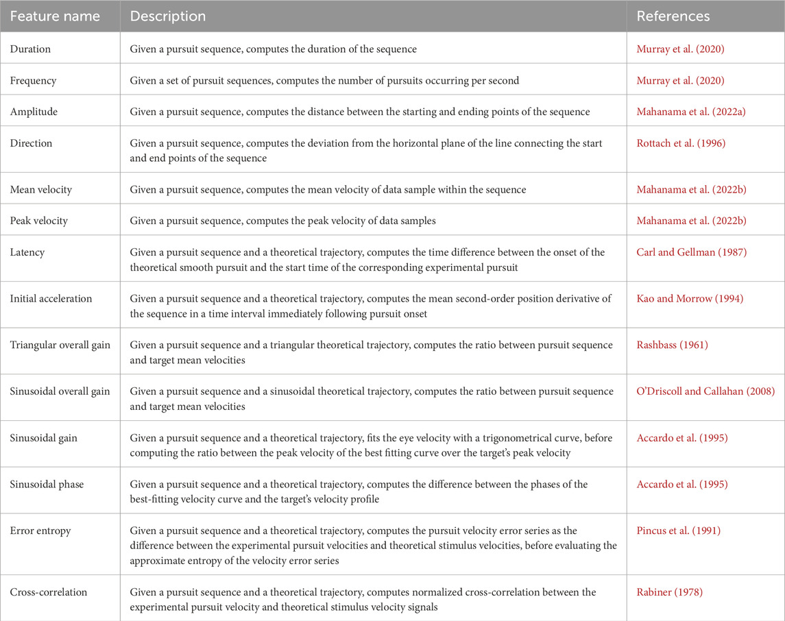 The fundamental features and metrics for fixations, saccades, and smooth pursuits are summarized in Tables 1–3, respectively. The tables provide a concise description of each feature and references from the literature that offer guidance for their implementation.