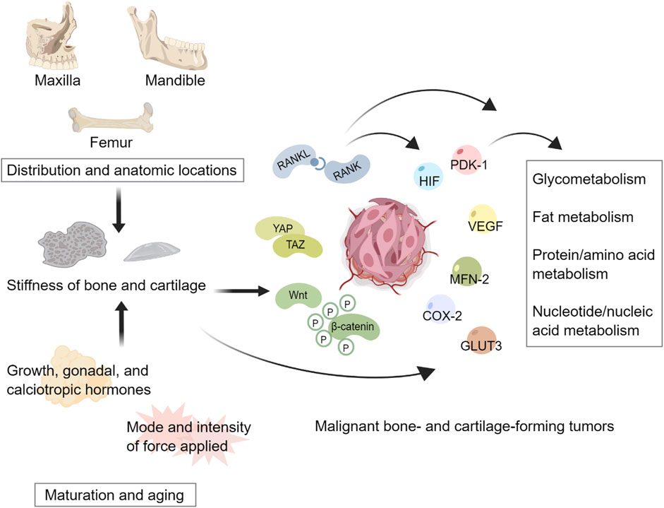 Bone stiffness plays a significant role in the reprogramming of tumor metabolism. The growth and spread of OS, CS, and mesenchymal CS are highly sensitively to mechanical stimuli, with the RANKL/RANK, Wnt, and Hippo pathways playing crucial roles (Shoaib et al., 2022; Hsu et al., 2010; Kovar et al., 2020; Kelleher et al., 2012). RANKL is generated by various cell types, including osteocytes, osteoblasts, and immune cells. When it binds to the RANK receptor, it triggers the differentiation and activation of osteoclasts. The RANKL/RANK pathway regulates bone development, remodeling, and is implicated in bone-related disorders like osteoporosis and tumors (Rao et al., 2018; Ono et al., 2020; Rachner et al., 2011). Moreover, multiple tumor cells, including OS, can produce RANK, leading to an increase in RANKL expression (Kukita and Kukita, 2013; Tan et al., 2011) and changes in the metabolic regulator MAPK expression and mitochondrial homeostasis of tumor cells (Yuan et al., 2020; Rao et al., 2017).