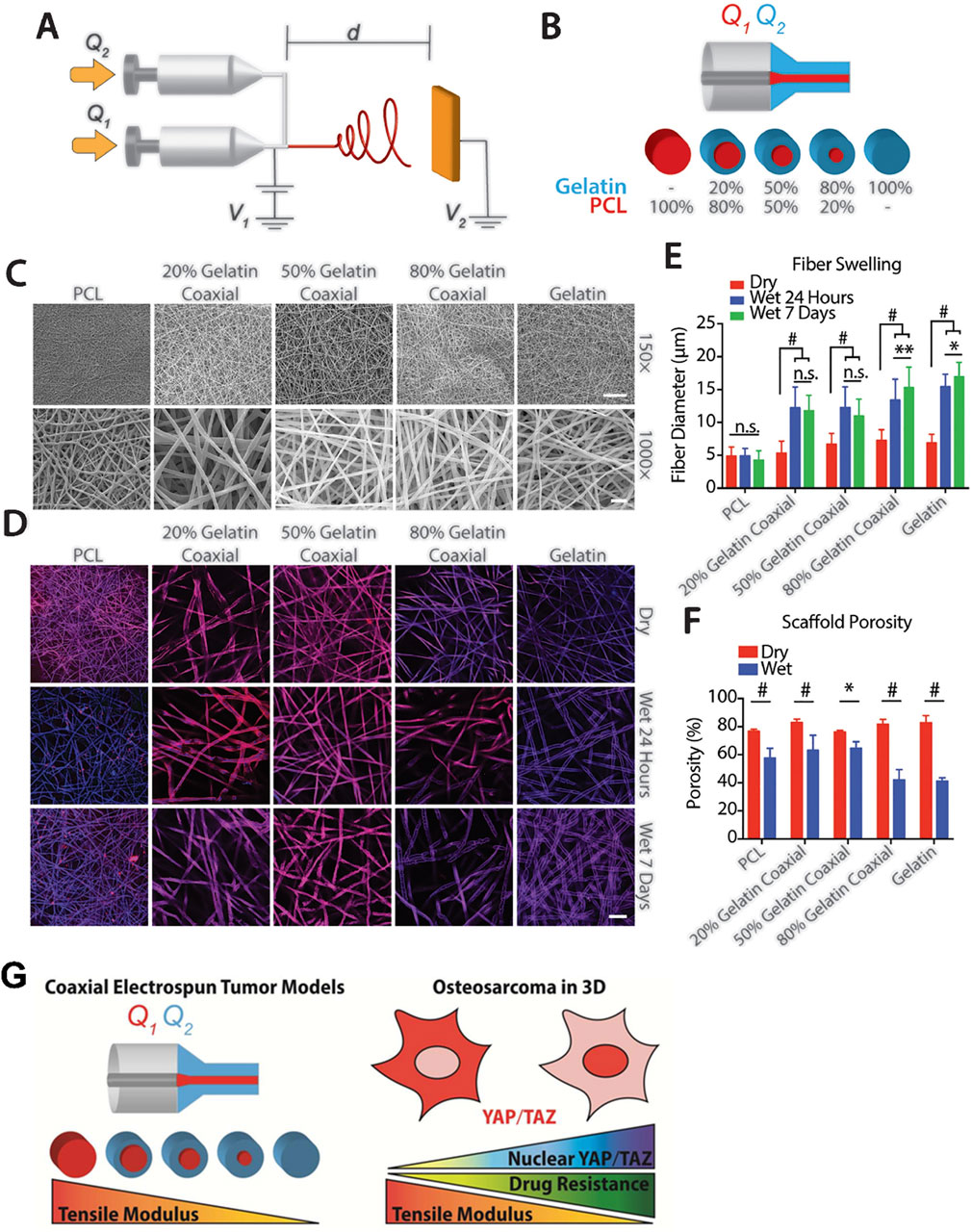 Figure 3. Construction of bone stiffness biomimetic scaffolds using electrospinning technology for the research of osteosarcoma. (A) Schematic diagram of a coaxial electrospinning device. (B) Schematic representation of the composition of single fibers in electrospun meshes with different PCL and gelatin ratios. (C) Representative electron microscopy images mesh composed of five fiber types with different core-shell PCL-gelatin compositions. (D) Representative confocal microscopy images of a single plane illustrating fiber swelling in an aqueous solution. Top: Dry fibers. Middle: Fibers after 24 h in aqueous solution. Bottom: Fibers after 7 days in aqueous solution, scale bar = 50 μm. (E) Swelling of individual fibers assessed by measuring fiber diameter over time (n = 30 fibers per group at each time point). (F) Porosity of meshes with variable fiber composition in dry (red) and wet (blue) conditions after 24 h of submersion in aqueous solution. n = 3. n.s. = no significance, *p < 0.05, **p < 0.01, #p ≤ 0.001. (G) Schematic diagram indicating an increase in the nuclear import of YAP/TAZ and drug resistance of osteosarcoma cells as the elastic modulus of the bone stiffness biomimetic scaffold decreases (Molina et al., 2019).
