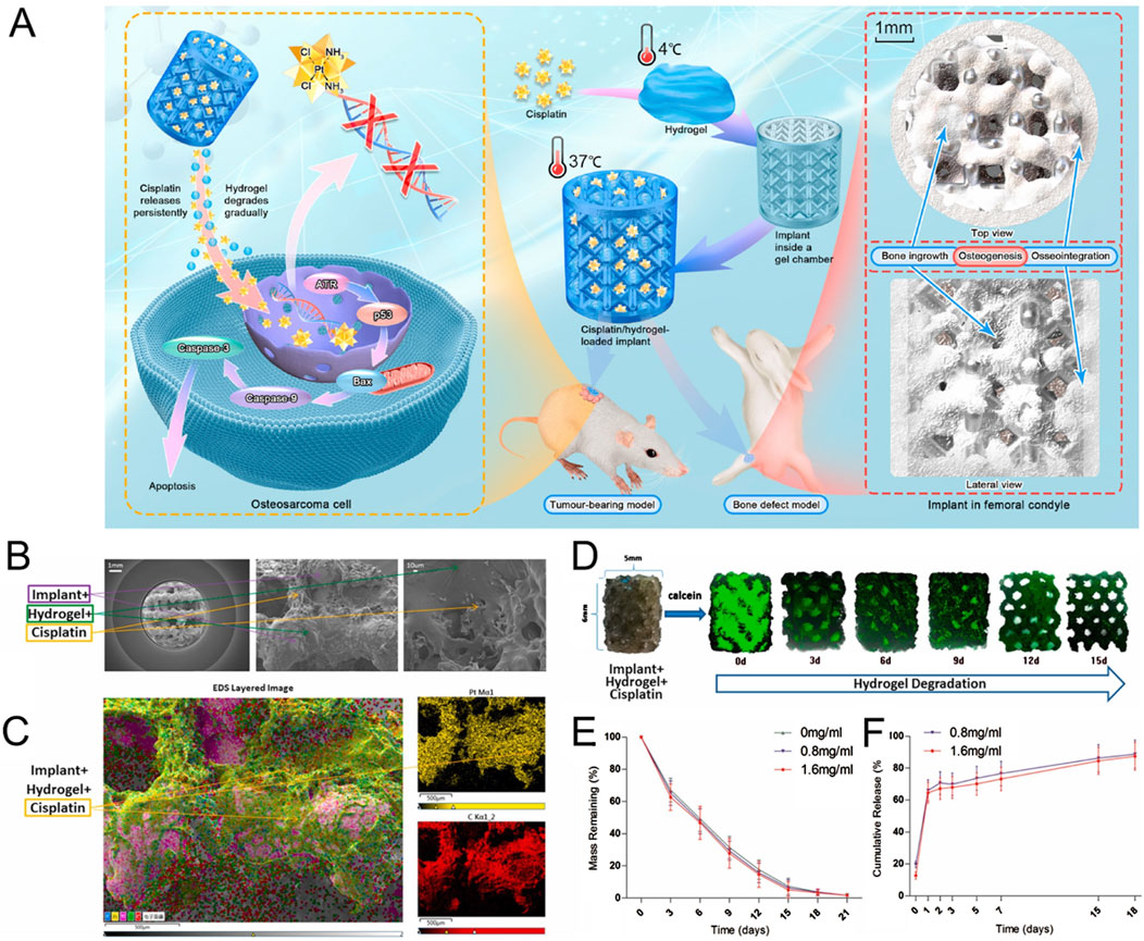 Figure 4. Construction of anti-osteosarcoma bone substitutes using three-dimensional printing technology. (A) Schematic illustration of the method for preparing cisplatin/hydrogel-loaded three-dimensional-printed Ti6Al4V implants, which exhibit anti-tumor and bone-repairing effects. (B) Representative electron microscopy images of cisplatin/hydrogel-loaded Ti6Al4V implants. (C) Representative energy dispersive spectroscopy layer images showing cisplatin integration into the hydrogel. (D) In vitro degradation of the hydrogel (green) incorporated into the implants (0–15 days). (E) Mass remaining of hydrogel (0–21 days). (F) In vitro release profile of cisplatin from the cisplatin/hydrogel-loaded Ti6Al4V implants (0–18 days). n = 3 (Jing et al., 2021).