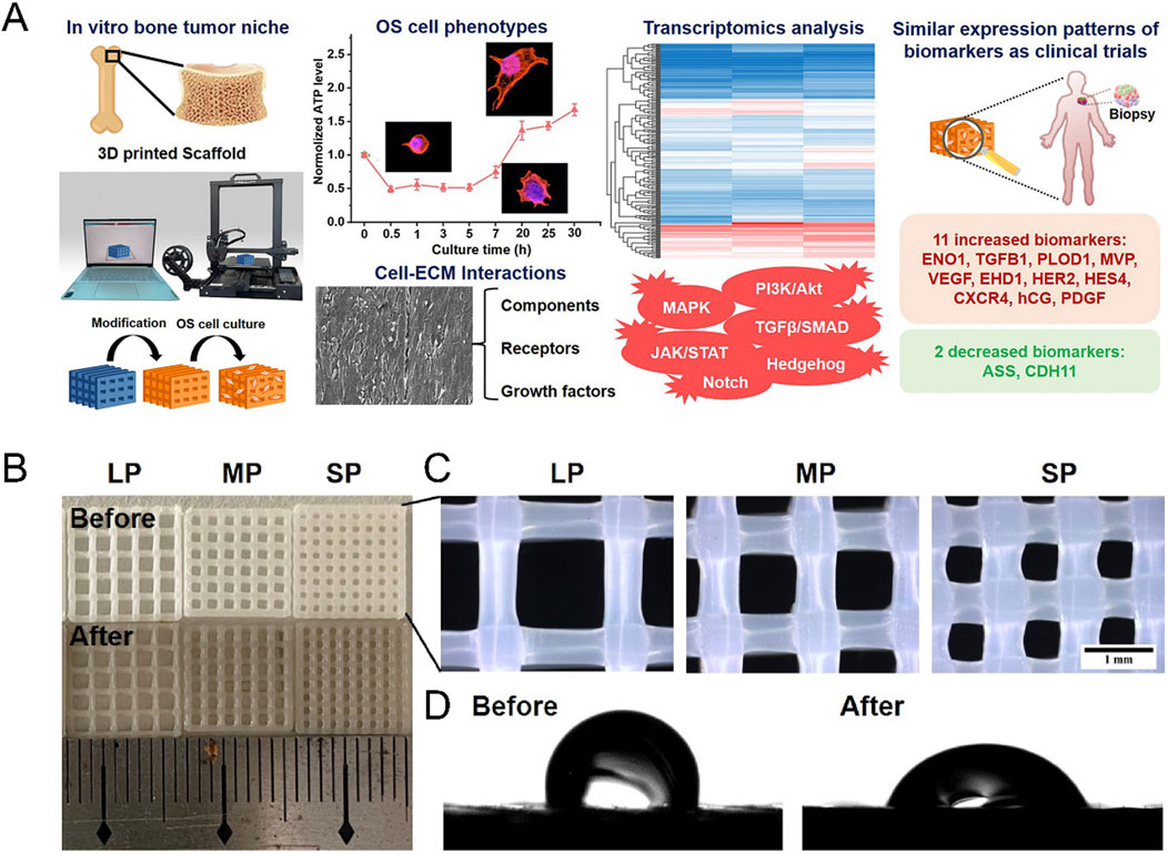 Figure 5. Construction of bone stiffness biomimetic scaffolds using three-dimensional printing technology for the research of osteosarcoma. (A) Schematic illustration of the development of bone stiffness biomimetic scaffolds from PLLA, fabricated by three-dimensional printing technology, for in vitro three-dimensional culture of osteosarcoma cells. Cells cultured in this scaffold exhibit characteristics closer to those of osteosarcoma patient biopsy samples. (B) Representative photographs of PLLA scaffolds. (C) Representative stereomicroscope images of PLLA scaffolds. BP (big pore), MP (medium pore), SP (small pore). (D) Water contact angles of PLLA scaffolds with and without dopamine coating (Wang ML. et al., 2022).