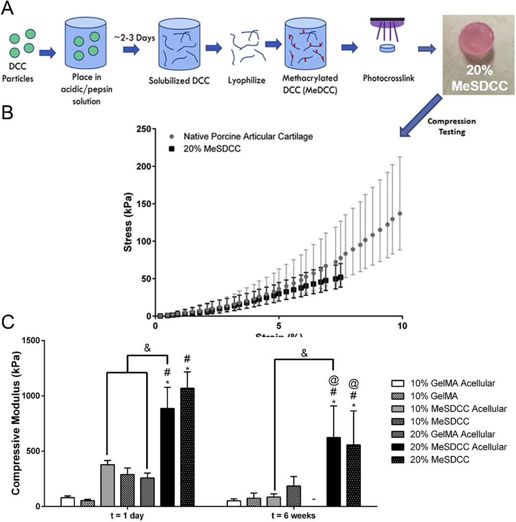 Figure 6. Construction of cartilage stiffness biomimetic decellularized cartilage-based hydrogel scaffolds for three-dimensional cell culture. (A) Schematic illustration of the methacrylated solubilized decellularized cartilage (MeSDCC) hydrogels synthesis process. (B) Stress-strain curves of native porcine cartilage and hydrogels. Data are reported as mean ±95% confidence interval. The results show that the 20% MeSDCC hydrogels fell within the 95% confidence interval of native porcine cartilage until it begins to fracture at an average strain of 7.5%. (C) Compressive modulus of hydrogels with or without rat bone marrow stems cells encapsulated shows that 20% MeSDCC hydrogels with cells encapsulated had similar modulus to porcine cartilage (Beck et al., 2016).
