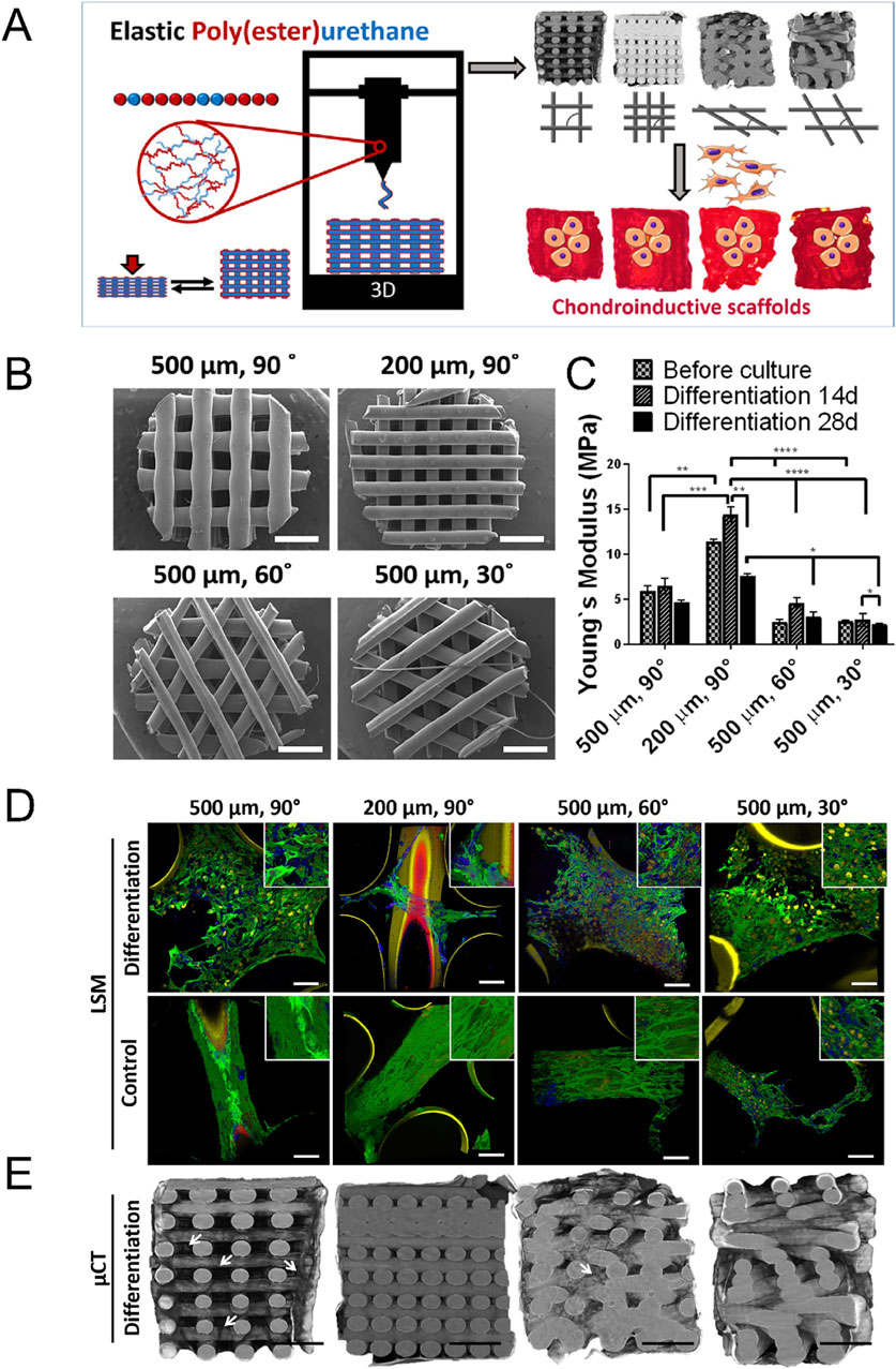 Figure 7. Construction of cartilage stiffness-mimicking poly(ester)urethane (PEU) scaffolds using three-dimensional printing technology for three-dimensional cell culture. (A) Schematic representation of the PEU scaffold manufacturing process. These scaffolds are designed for the three-dimensional culture of osteosarcoma cells (ATDC5) in vitro. (B) Representative scanning electron microscope images of PEU scaffolds with varying pore sizes and deposition patterns. (C) Non-equilibrium compressive Young’s modulus of scaffolds in PBS, before and after 14 and 28 days of culture in differentiation media. Scaffolds with a 200 µm pore size and a 90° deposition pattern exhibit a modulus of approximately 10 MPa. Data are presented as mean ± SD, n = 3. (D) Representative light scanning microscopy images of scaffolds after culture in differentiation and basal media for 28 days. Green indicates F-Actin, Yellow indicates nuclei, Blue indicates collagen II, and Red indicates collagen I. (E) Representative micro-X-ray computed tomography reconstructions of scaffolds after culture in differentiation media for 28 days. The images demonstrate ATDC5 cell infiltration and ECM deposition within the scaffold pores (Camarero-Espinosa et al., 2020).