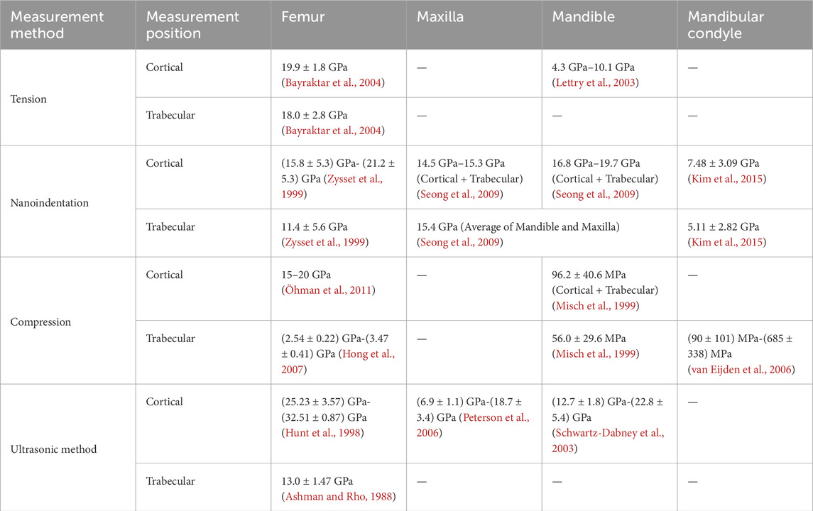 Approximately 90% of the bone ECM is composed of collagen, primarily type I collagen. Additionally, other proteins such as osteocalcin, osteopontin, and proteoglycans play crucial roles in facilitating the deposition of hydroxyapatite (HA) and the mineralization of collagen. These processes enhance the tensile modulus of bone, improve the energy dissipation, and increase the resistance to fractures (Nair et al., 2013; Zhu et al., 2021). The mechanical properties of bone exhibit significant spatial heterogeneity due to variations in composition and structure, which regulated with factors such as species, age, disease (Rezaei et al., 2019; Morgan et al., 2003; Romme et al., 2013). Cortical bone accounts for approximately 80% of the bone tissue, while cancellous bone makes up the remaining 20% (Hart et al., 2020). Cancellous bone is characterized by its porous structure, which shows lower calcium content, and an elastic modulus that is approximately 10% lower than that of cortical bone (Bayraktar et al., 2004). It should be noted that in different reports, the modulus may differ significantly (Table 1), up to three times, depending on the measurement site and method used (Morgan et al., 2003; Romme et al., 2013; Wu et al., 2018).