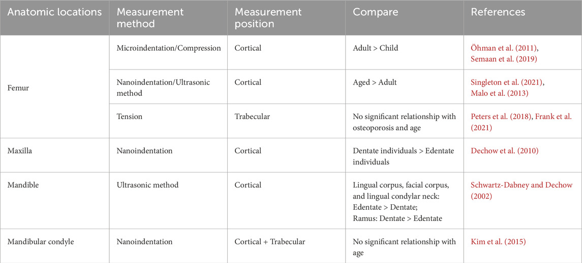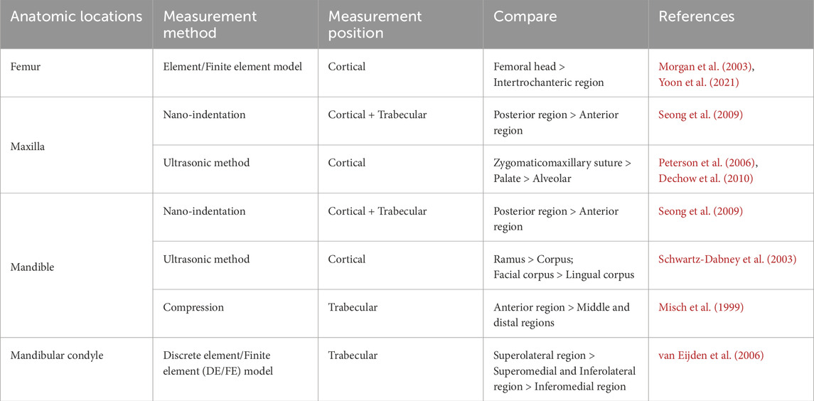 The age-related changes in the jaw encompass multiple aspects. Table 3 provides some measurement data regarding the temporal heterogeneity of human bone stiffness. During the maturation of cortical bone, there is an increase in thickness, density, and stiffness, while anisotropy decreases (Wang et al., 2010). Although aging leads to a decrease in cortical density and an increase in jaw porosity, it may not necessarily be associated with tooth loss (Atkinson and Woodhead, 1968). There are differing viewpoints on how tooth extraction can affect the thickness, density, modulus, and directional orientation of the craniofacial cortical bone, with some studies suggesting that the degree of trabecular resorption based on tooth loss is greater compared to cortical bone (Dechow et al., 2010; Bertl et al., 2015). Additionally, age-related changes in bone are not entirely consistent across different positions. The mandible exhibits a faster growth rate than the maxilla during adolescence (Nahhas et al., 2014). The volume of alveolar bone between teeth roots may increase with age, while the tibia demonstrates an age-dependent decrease in trabecular amount and subchondral bone mass (Nenda et al., 2016). Interestingly, a report suggests that aging, as a single factor, may not have a significant impact on the material properties of the mandibular condyle (Kim et al., 2015). From these discussions, it becomes evident that the temporal heterogeneity of jaw material properties is complex and controversial, necessitating further research in the future.