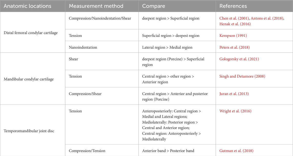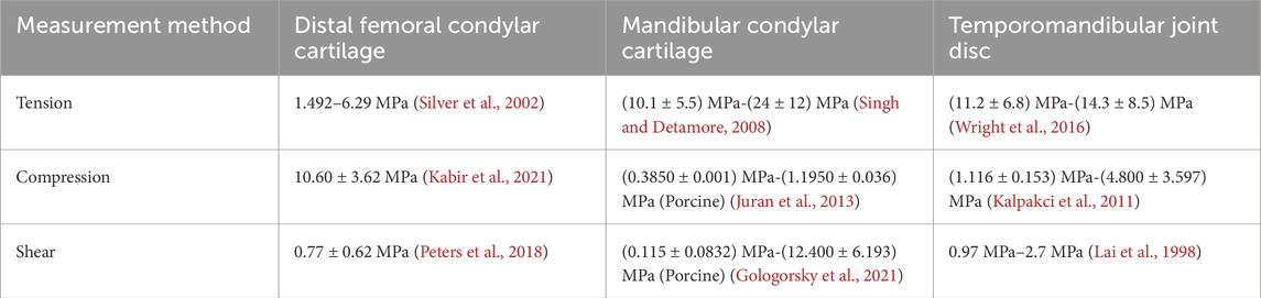 The TMJ is not completely consistent with other joints in terms of its structure. Not only is it covered with cartilage on the surface of the mandibular condyle and articular tubercle of the temporal bone, but it also features a disc with uneven thickness that separates the articular surfaces (Kuroda et al., 2009). Table 4 presents comparative data on the cartilage moduli of the distal femoral condyle, mandibular condyle, and TMJ disc, including human and porcine cartilage (the mechanical properties of porcine and human cartilage are similar). For instance, the tensile modulus of the mandibular condyle cartilage and disc is higher than that of the distal femoral condylar cartilage (Wright et al., 2016; Silver et al., 2002; Singh and Detamore, 2008), whereas the compressive modulus exhibits an opposite trend (Kabir et al., 2021; Juran et al., 2013; Kalpakci et al., 2011).