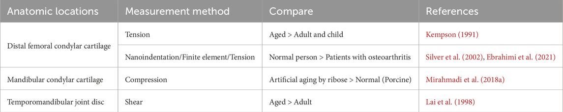 Similar to bone, the moduli of cartilage also undergo changes as age (Table 6). Chondrocytes, which are responsible for producing the ECM of cartilage, play a crucial role in the formation and degradation of cartilage. As cartilage mature and age, there are alterations in chondrocyte number, phenotype, and mechanical sensitivity. These changes subsequently affect various aspects of the ECM, including its quantity, morphology, size, structure, and other components (Martin and Buckwalter, 2001; Chen PJ. et al., 2020; Fan et al., 2022). With advancing age, there is a shift from cartilage to bone replacement in the TMJ cartilage. This is characterized by an increase in the volume fraction and density of the condylar bone, while the thickness of the cartilage decreases. In younger individuals, the mandibular condylar cartilage and subchondral bone exhibit active differentiation of osteoclasts. However, in aging individuals, there are fewer osteoclasts and cartilage collagen cells in the subchondral bone. Additionally, there is a loss of aggrecan from ECM and an increase in collagen fibers migrating towards the cartilage surface. These changes are accompanied by the migration of the mineralization front towards the uncalcified layer of the cartilage (Chandrasekaran et al., 2021; Chen PJ. et al., 2020). In the end, the age-dependent remodeling of the ECM described above leads to a decrease in the shear modulus of cartilage and an increase in the elastic modulus of the subchondral bone (Peters et al., 2018).