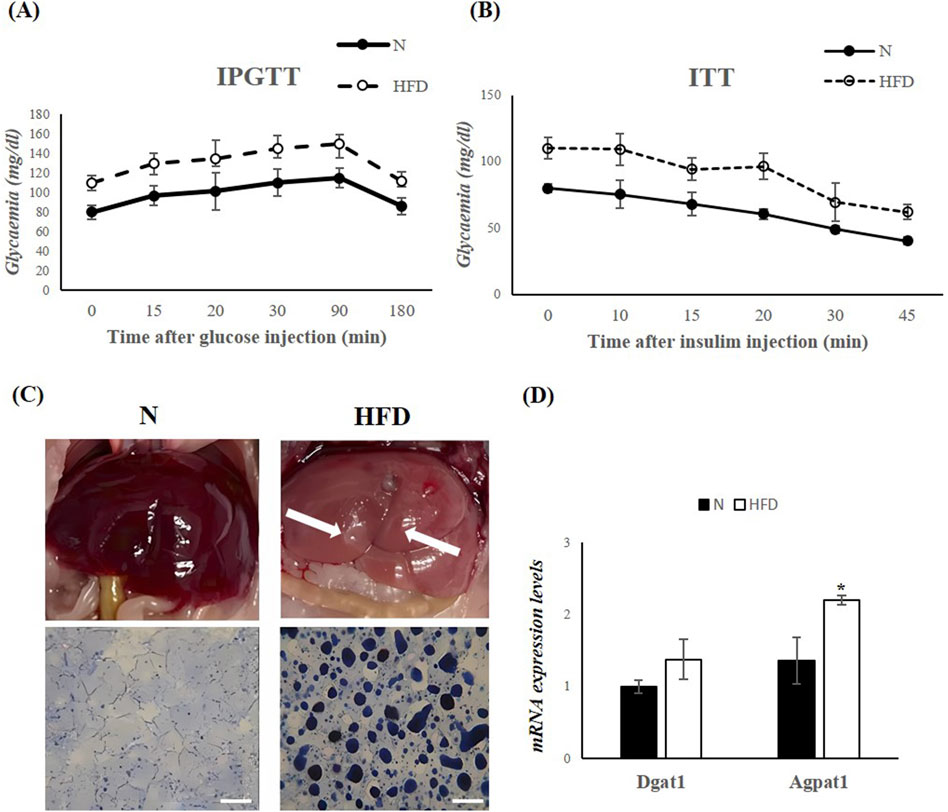 Graphs and images comparing normal (N) and high-fat diet (HFD) effects. (A) IPGTT: Glycemia levels over time after glucose injection, showing higher levels in HFD. (B) ITT: Glycemia levels after insulin injection, decreasing more in N. (C) Liver photos: Normal liver appears darker and smooth; HFD shows paler liver with lesions indicated by arrows. Microscopic images exhibit more lipid droplets in HFD. (D) mRNA expression levels indicate increased Agpat1 in HFD, marked by an asterisk, while Dgat1 shows no significant difference.