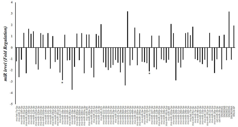 Figure 2. Serum miRNA Profling in N and HFD Rats. Fold regulation of miRNA levels detectable in the serum of 6 HFD rats versus 6 N rats (n = 6). N: rats receiving a standard diet for 5 weeks; HFD: rats fed on a high-fat diet for 5 weeks. Values with different symbols are significantly different: *P < 0.05 vs. N.