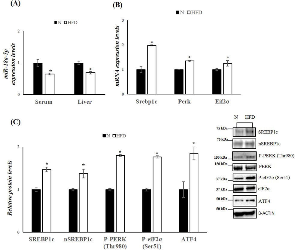 Figure 3. HFD affects miR-18a-5p expression and activates the UPRER pathway in the liver of rats. (A) qRT-PCR analysis of miR-18a-5p in serum and liver samples of N and HFD rats (B) qRT-PCR analysis of Srebp1c, Perk and Eif2α in liver samples of N and HFD rats (C) WB images and densitometry of SREBP1c, nSREBP1c, P-PERK (Thr980), P-eiF2α(Ser51) and ATF4 in liver samples of N and HFD rats. Histograms show the results of densiometric analysis of immunoblots. The protein level was normalized to that of B-ACTIN and/or to the total forms for phosphorylated proteins. Representative blots are shown. N: rats receiving a standard diet for 5 weeks; HFD: rats fed on a high-fat diet for 5 weeks. Values are the means ± SEM of six different rats (n = 6). Values with different symbols are significantly different: *P < 0.05 vs. N.