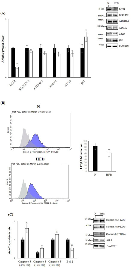 Figure consists of three panels analyzing protein levels and fluorescence. Panel A shows a bar graph and Western blot images comparing relative protein levels of LC3B, BECLIN-1, and others between normal (N) and high-fat diet (HFD) groups. Panel B displays fluorescence histograms and a bar graph illustrating LC3B fold induction under normal and HFD conditions. Panel C presents a bar graph and Western blot images comparing levels of different caspase-3 forms and Bcl-2 between diet groups, indicating alterations in protein expression levels.