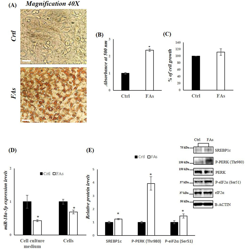 Figure 5. FAs mixture affects miR-18a-5p expression and activates the UPRER pathway in HepG2 cells. (A) ORO staining of TG accumulation in HepG2 cells treated with or without FAs. Original magnification: 40x. Scale bar = 100 μm (B) Oil Red O quantification in HepG2 cells treated with or without FAs (C) MTT assay to measure cell viability in HepG2 cells treated with or without FAs (D) qRT-PCR analysis of miR-18a-5p in cell culture medium and HepG2 cells treated with or without FAs (E) WB images and densitometry of SREBP1c, P-PERK (Thr980) and P-eiF2α (Ser51) in HepG2 cells treated with or without FAs. Histograms show the results of densiometric analysis of immunoblots. The protein level was normalized to that of B-ACTIN and/or to the total forms for phosphorylated proteins. Representative blots are shown. Ctrl: HepG2 cells treated with 1% BSA-free fatty acids for 24 h; FAs: HepG2 cells treated with oleate and palmitate (1.5 mM final concentration, 2:1 M ratio) for 24 h. Values are the means ± SEM of three independent experiments (n = 3). Values with different symbols are significantly different: *p < 0.05 vs. Ctrl.