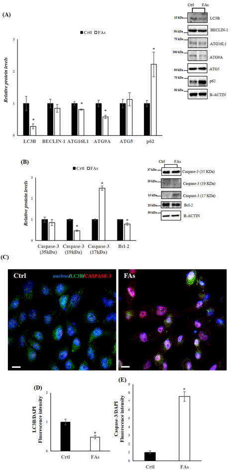 The figure consists of multiple panels. Panel A shows a bar graph comparing relative protein levels of LC3B, Beclin-1, ATG16L1, ATG9A, ATG5, and p62 between control and FAs, alongside corresponding Western blot images. Panel B presents a bar graph for Caspase-3 (35, 19, 17kDa) and Bcl-2, with matching Western blots. Panel C displays fluorescence microscopy images of cells stained for nuclei, LC3B, and Caspase-3 in control and FAs. Panels D and E show bar graphs of fluorescence intensity for LC3B/DAPI and Caspase-3/DAPI, respectively. Asterisks indicate significant differences.