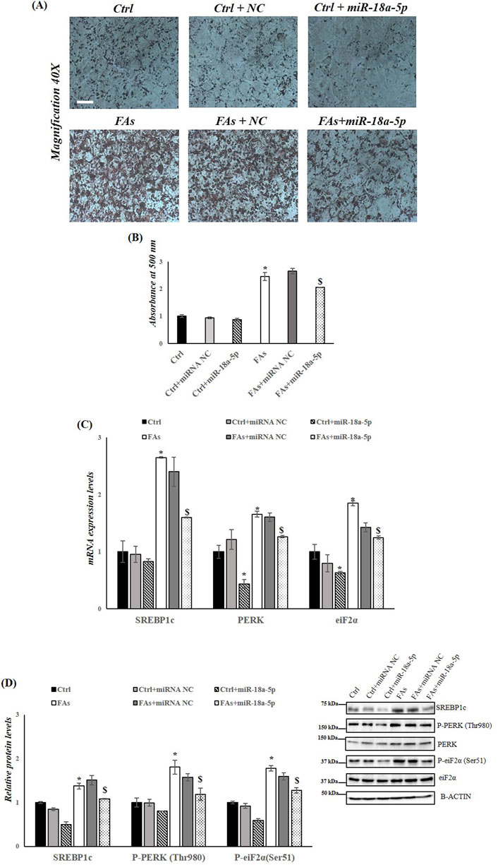 Microscopic images, bar graphs, and protein expression data illustrating the effect of various treatments on cellular components. (A) Microscopic images at 40x magnification show differences under treatments Ctrl, Ctrl + NC, Ctrl + miR-18a-5p, FAs, FAs + NC, and FAs + miR-18a-5p. (B) A bar graph representing absorbance at five hundred nanometers under different conditions. (C) mRNA expression levels for SREBP1c, PERK, and eIF2α across the treatments. (D) Bar graph and Western blot analysis showing relative protein levels of SREBP1c, P-PERK (Thr980), and P-eIF2α (Ser51) with corresponding loading controls.