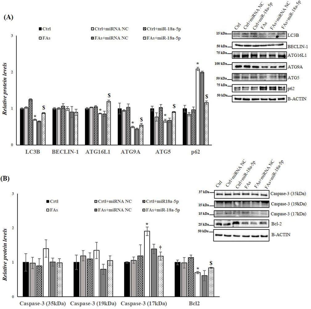 Figure 6. FAs mixture affects Autophagy and Apoptosis in HepG2 cells. (A,B) WB images and densitometry of LC3B, BECLIN-1, ATG16L1, ATG9A, ATG5, p62, Caspase-3 (35, 19 and 17 kDa), and Bcl-2 in HepG2 cells treated with or without FAs. Histograms show the results of densiometric analysis of immunoblots. The protein level was normalized to that of B-ACTIN. Representative blots are shown (C) IF analysis of LC3B and Caspase-3 in HepG2 cells treated with or without FAs. Slides were counterstained with DAPI (blue), which mark the nucleus. Original Magnification 40x, scale bars 20 μm (D) and (E) Histogram showing the quantification of LC3B and Caspase-3 fluorescence signal intensity with respect to DAPI signal. Crtl: HepG2 cells treated with 1% BSA-free fatty acids for 24 h; FAs: HepG2 cells treated with oleate and palmitate (1.5 mM final concentration, 2:1 M ratio) for 24 h. Values are the means ± SEM of three independent experiments (n = 3). Values with different symbols are significantly different: *p < 0.05 vs. Crtl.