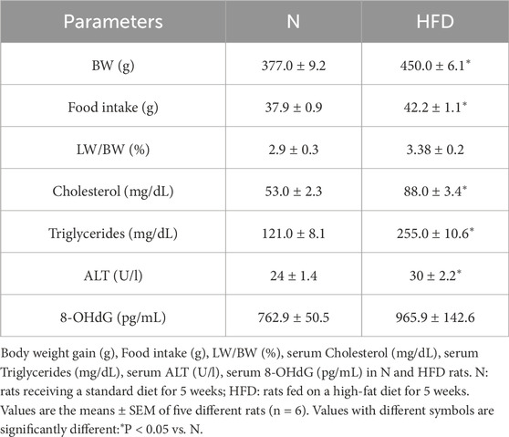 Table 3. Body Weight gain (BW), Food intake, LW/BW, serum Cholesterol, serum Triglycerides, serum ALT and serum 8-OHdG levels in N and HFD rats.
