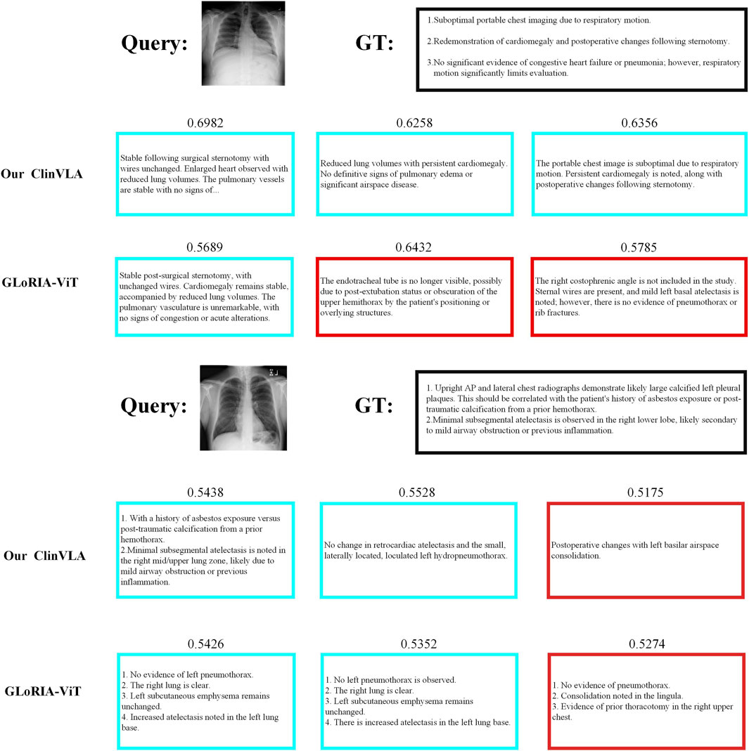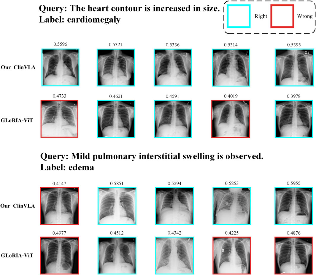 As shown in Figure 3, we present a qualitative comparison of the ClinVLA model and the GLoRIA-ViT model in the text-to-image retrieval task. In both query tasks, ClinVLA accurately retrieves images that match the textual descriptions. Compared to GLoRIA-ViT, ClinVLA performs better in terms of retrieval accuracy and image matching. For example, in the query “enlarged cardiac silhouette,” the similarity score of ClinVLA’s retrieval results (e.g., 0.5956) is significantly higher than that of GLoRIA-ViT (e.g., 0.4733), demonstrating ClinVLA’s advantage in understanding the relationship between textual descriptions and image content. Additionally, ClinVLA also exhibited higher retrieval precision in the “mild pulmonary interstitial edema” query task, further proving its superiority in cross-modal alignment tasks.