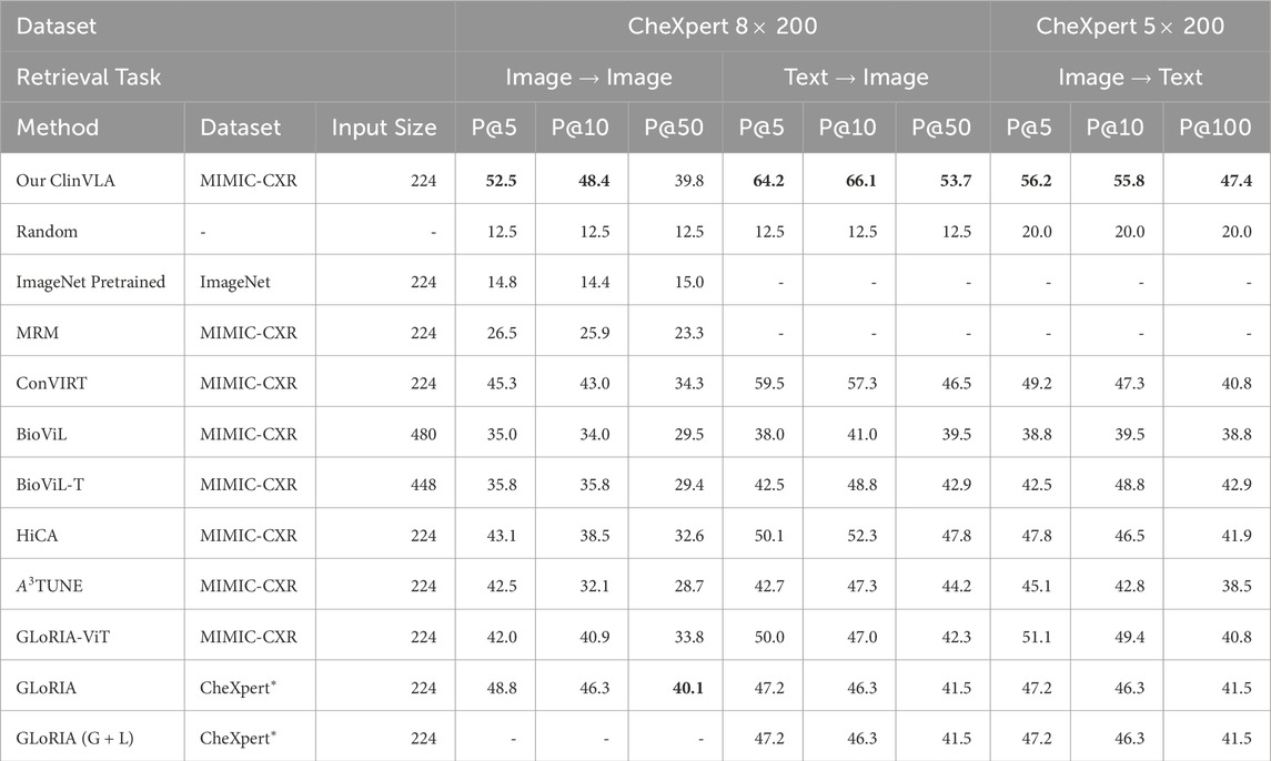As shown in Table 3, we designed three comparative experiments, including image-to-image, text-to-image, and image-to-text retrieval tasks on the CheXpert 8