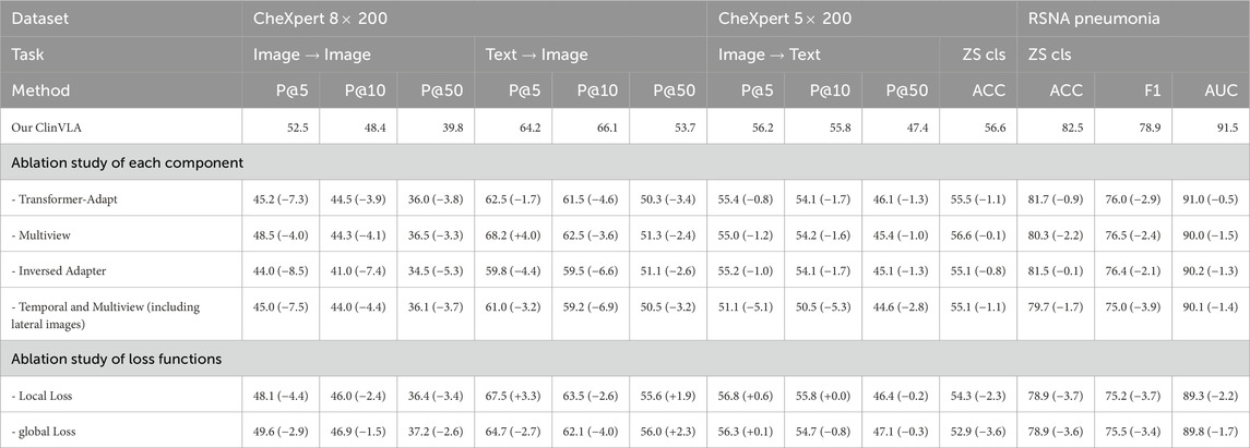 As shown in the Table 6, we conducted ablation experiments on the ClinVLA model to assess the impact of different components and loss functions on model performance. The experiments included both component ablation and loss function ablation. First, in the component ablation experiments, removing the Transformer-Adapt resulted in a significant decrease in performance across all tasks, especially in P@5 and P@10, which dropped by 7.3% and 3.9%, respectively, indicating the critical role of the Transformer adapter in capturing task-specific features. Removing Multiview led to a decrease of 4.0% and 3.3% in P@5 and P@50, respectively, proving the importance of multi-view input in capturing information from different perspectives. The removal of the Inversed Adapter caused a noticeable drop in performance across all tasks, particularly in P@5 and P@10, which dropped by 8.5% and 7.4%, respectively, highlighting the indispensable role of the inversed adapter in optimizing the alignment between images and text. Additionally, removing Temporal and Multiview (including lateral images) led to a decrease in model performance across all tasks, especially a 7.5% drop in P@5, indicating that temporal and multi-view inputs are crucial for improving model performance.