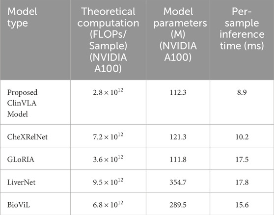 Table 7 presents a comparison of the computational complexity of different medical vision-language models, focusing on core metrics such as model type, theoretical computation (based on NVIDIA A100, in FLOPs/sample), model parameters (based on NVIDIA A100, in M), and per-sample inference time (in ms). Five models are included in the comparison. Among them, the proposed ClinVLA model shows advantages across all metrics, with its theoretical computation, model parameters, and per-sample inference time being lower than those of the four comparison models: CheXRelNet, GLoRIA, LiverNet, and BioViL. Notably, the ClinVLA model excels in computational efficiency, and this comparison highlights its value in reducing computational burdens and improving practical application performance, providing data support for its efficient use in medical scenarios.