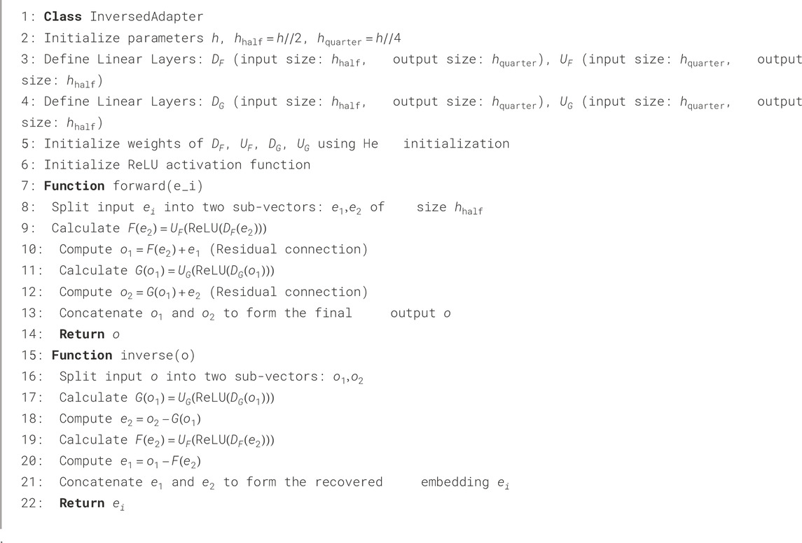 The complete architecture of the reversible adapter and its inverse is shown in Figures 2a,b, with the detailed implementation provided in Algorithm 1. We split the input embedding vector