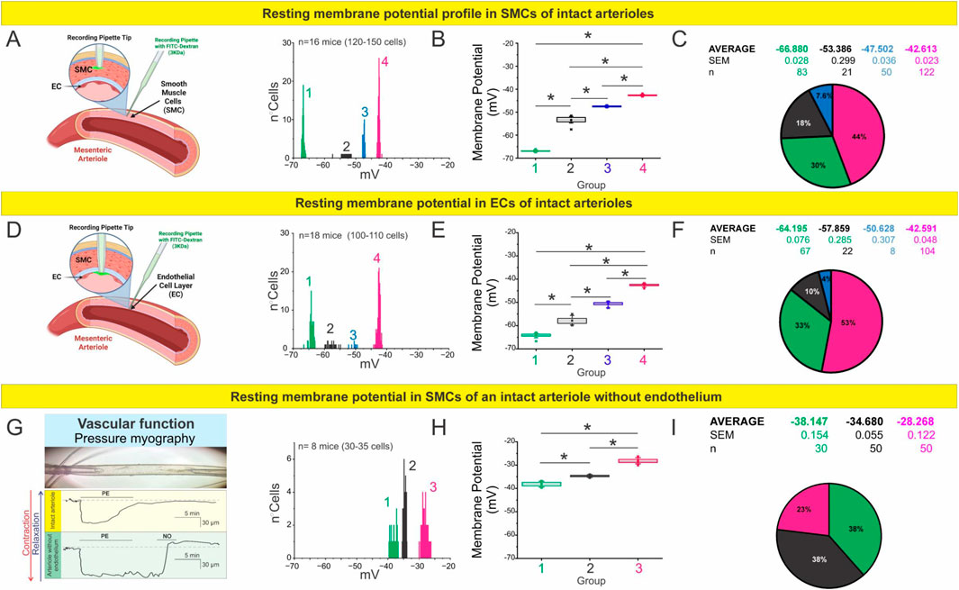Figure 1. The endothelium regulates the membrane potential profile of mesenteric arterioles. (A–C) RMP profile of smooth muscle cells (SMCs) in intact mesenteric arterioles. (A) Schematic illustration of sharp electrode intracellular recordings in SMCs using Alexa Fluor 488–labeled pipettes. The histogram shows RMP distributions across 120–150 SMCs obtained from n = 16 mice, revealing four distinct membrane potential clusters. (B) Boxplot summarizing the average RMP of each cluster. Statistical analysis was performed using nested ANOVA followed by Tukey’s multiple comparison post test (p < 0.001). (C) Pie chart representing the relative proportion and mean ± SEM of each RMP cluster. (D–F) RMP profile of endothelial cells (ECs) in intact mesenteric arterioles. (D) Schematic of intracellular recordings targeting ECs. The histogram shows RMP distributions across 100–110 cells from n = 18 mice, identifying four distinct populations. (E) Boxplot summarizing average RMP values for each cluster. Nested ANOVA followed by Tukey post test (p < 0.001) confirmed significant differences among all groups. (F) Pie chart showing the relative distribution and mean ± SEM values of each subpopulation. (G–I) RMP profile of SMCs in arterioles after endothelial removal. (G) Representative pressure myography traces demonstrating preserved contractile and vasodilatory responses to phenylephrine (PE) and nitric oxide (NO), confirming the functional integrity of denuded vessels. (H) Histogram and boxplot of RMPs from 30 to 35 SMCs (n = 8 mice), analyzed by nested ANOVA followed by Tukey post test (p < 0.001). (I) Pie chart summarizing the relative proportions and mean ± SEM for each cluster, showing a depolarized profile compared to intact vessels, underscoring the critical role of the endothelium in establishing vascular electrical states.