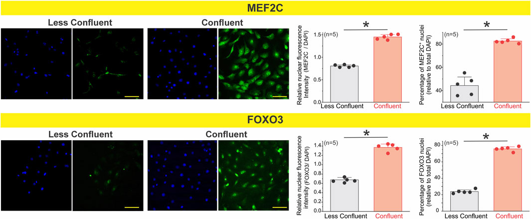 Figure 7. Nuclear accumulation of the transcription factors MEF2C and FOXO3 increases in coupled endothelial cells. Primary mesenteric endothelial cells were cultured at low or high confluence and immunostained for MEF2C and FOXO3. Representative images show reduced nuclear localization of both transcription factors under less coupled conditions and marked nuclear enrichment at confluence. Quantification was performed on ∼200–300 cells per condition, across 3 coverslips per culture, for a total of n = 5 independent cultures. Each biological replicate (n) represents the averaged value of its three coverslips. Coupled endothelial cells exhibited a significantly greater percentage of MEF2C- and FOXO3-positive nuclei and higher normalized nuclear fluorescence intensity compared with less coupled cultures. These results indicate that transcription factor nuclear accumulation is enhanced when mesenteric endothelial cells establish intercellular coupling. Statistical significance was assessed using nested one-way ANOVA, with cells nested within coverslips and coverslips nested within experiments (P < 0.001).