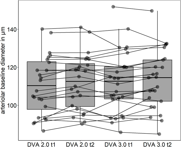 Intraindividual day-to-day variations may thus limit the potential to use this technique to monitor individual disease progression. In our EXAMINE AGE study, we have recently demonstrated that healthy and very active individuals showed similar aFID compared to CV risk patients (Streese et al., 2019). This phenomenon could be attributed to the differences in arteriolar diameters between the two groups prior to the flicker light stimulation. When the arteriolar diameter was reduced by BP-induced myogenic constriction before flicker light stimulation, a significant better response was observed in the healthy and active group compared to the CV risk patients (Streese et al., 2021b). We have previously shown that the individual baseline diameter is an important driver for the arteriolar flicker-light response (Streese et al., 2019; Streese et al., 2021b). Although we did not observe a significant difference in baseline diameters between the two time points of arterioles and venules in our sample, the values exhibit considerable variation. With comparable maximum absolute diameters after flicker light stimulation these variations in baseline diameter markedly influence the percentage-based dilatory capacity. Similar issues have already been reported with other percentage-based methods (Atkinson and Batterham, 2013). Therefore, the resting diameter should always be considered. The present study, along with the improvements in day-to-day variability after correcting for arteriolar baseline diameter (aMAX), assuming Gullstrand’s normal eye, underscores the importance of considering both vessel structure and functional capacity when interpreting microvascular health. We therefore recommend to correct for baseline diameter variations when monitoring disease progression in individuals.