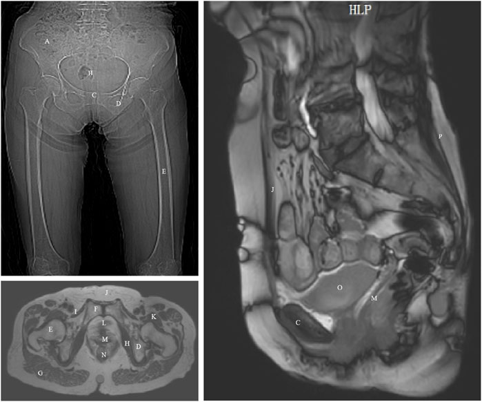 Medical imaging displays three views: a frontal X-ray of the lower torso and legs with labeled sections A to E, an MRI transverse section showing the pelvic area with labels G to N, and a sagittal MRI view of the abdomen with labels C, J, M, O, and P. Each image highlights different anatomical features for analysis.