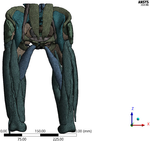 Figure 3 illustrates the mesh division of the 3D finite element model, comprising 69,635 nodes and 148,161 elements. A hybrid meshing strategy was applied to the composite model using both tetrahedral and hexahedral elements, which optimizes simulation efficiency without compromising anatomical fidelity. This mesh layout ensured accurate force transmission across the integrated pelvic-thigh model and facilitated subsequent load simulations under different rehabilitation scenarios.