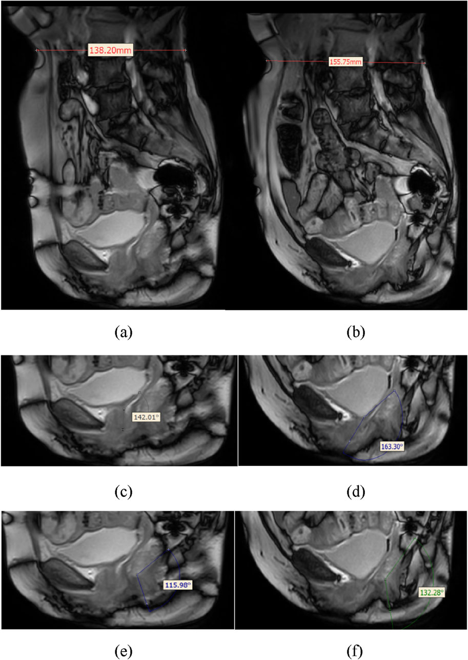 Figure 4. Schematic diagram showing anatomical measurements of the relative changes in waistline, RVA, and ARA from dynamic MRI in a human participant. (a) shows the waistline before Valsalva (138.20 mm), (b) shows the waistline after Valsalva (155.75 mm), (c) shows the RVA before Valsalva (142.01°), (d) shows the RVA after Valsalva (163.30°), (e) shows the ARA before Valsalva (115.98°), (f) shows the ARA after Valsalva (132.28°).