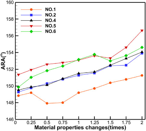 Line graph showing the relationship between material property changes and ARA in degrees. Five lines, labeled NO.1 to NO.6, depict various trends over times. NO.1 displays the lowest ARA, while NO.5 shows the steepest increase. The x-axis represents material properties changes, and the y-axis represents ARA in degrees, ranging from 146 to 160.